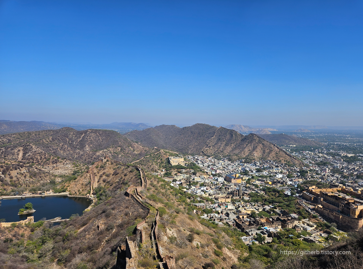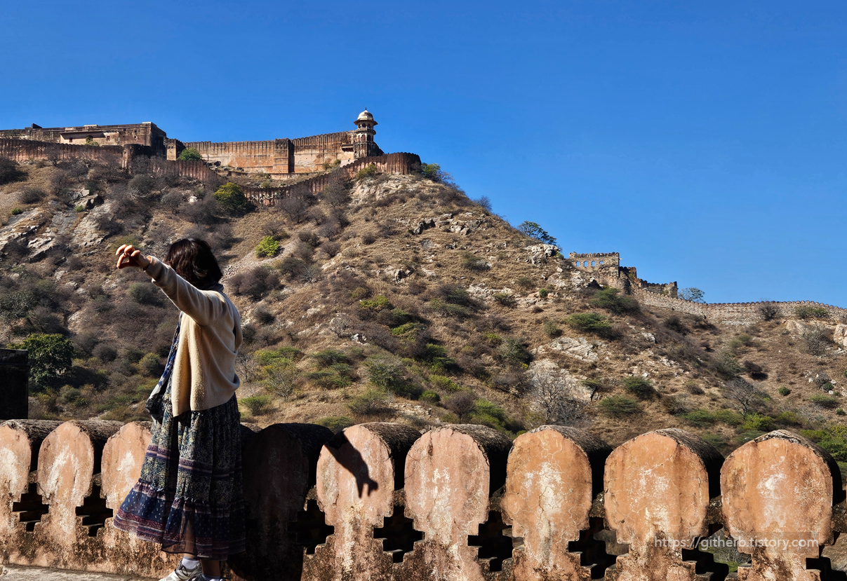 웅장한 성벽을 따라 걸으며 자이푸르 시내가 한눈에 보이는 뷰를 감상할 수 있습니다.